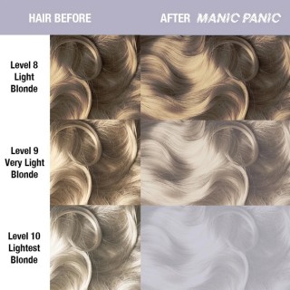 Silver Stiletto è una tinta argentata con sfumature lilla che aiuta a creare colori biondi freddi o argento. Si consiglia di schiarire i capelli fino al raggiungimento di un biondo molto chiaro (livello 11) e tonalizzare i capelli che hanno riflessi dorati/gialli prima di procedere con l'applicazione di Silver Stiletto. Questo colore può anche essere miscelato con le tue tonalità Manic Panic preferite per creare colori pastelli metallici.