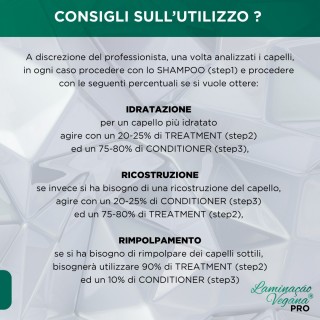 RICOSTRUZIONE: per una ricostruzione del capello, agire con un 20-25% di CONDITIONER (step3) ed un 75-80% di TREATMENT (step2)