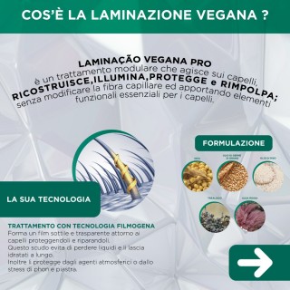 "Laminaçao Vegana" è un trattamento riscostruente, protettivo ed illuminante, che crea un sottile film attorno i capelli proteggendoli e riparandoli dagli agenti esterni.