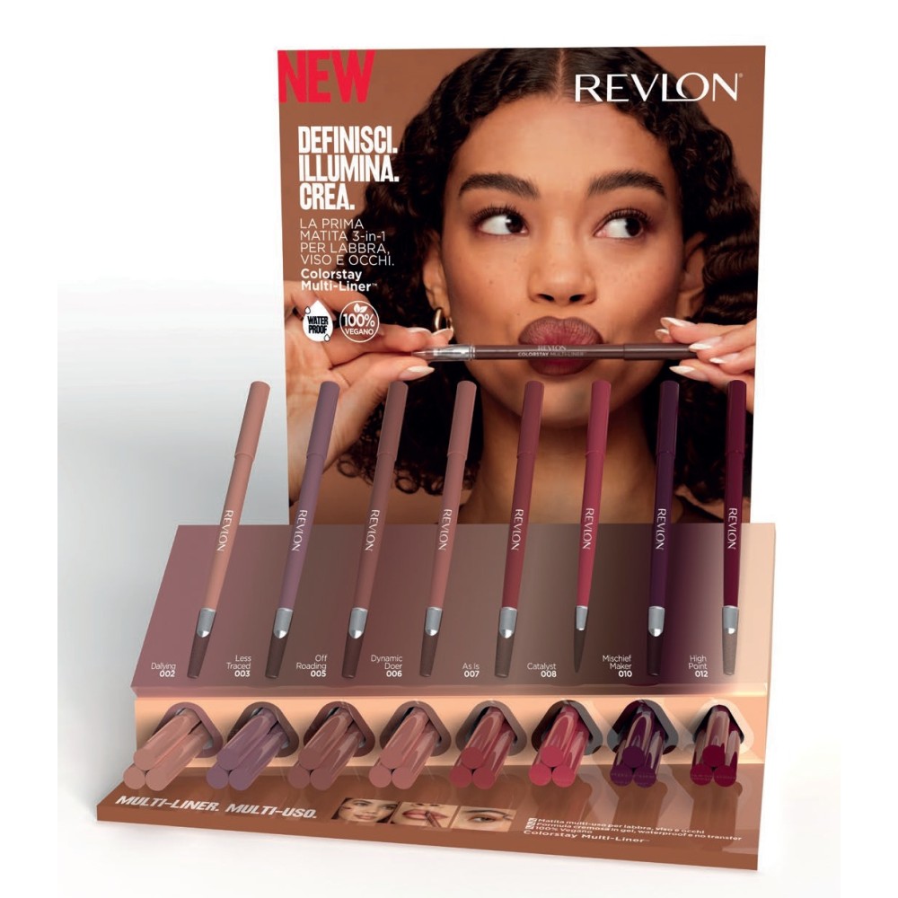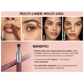 Valorizza il tuo viso con la nuova Revlon ColorStay Multi-Liner, una matita multi-uso, ideale per labbra, occhi* e viso. Questa matita temperabile e con pennello da sfumatura integrato, è perfetta per delineare, riempire e sfumare le labbra, per creare le lentiggini e fare il contouring e infine per illuminare e definire tutti i lineamenti del viso. La sua formula in gel, vegana e ultra-cremosa, permette un'applicazione precisa, veloce e facile da sfumare. Disponibile in 8 shade multi-uso e universali, 7 sui toni nude e naturali + 1 illuminante, adatte a tutti gli incarnati. Formulata con l'Adapti-Flex Technology™, regala una sensazione confortevole a lunga durata. No-Transfer & A Prova di Bacio. *La shade Mischief Maker non è adatta da utilizzare sugli occhi.